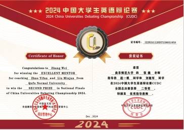 12月8日,2024年中国大学生英语辩论赛CUDC全国总决赛顺利收官。经过激烈的角逐,肉漫屋 张巍副教授指导的22级商英专业赵一帆和22级翻译专业刘敏军两位同学凭借充足的赛前准备,在辩论赛中展现精彩的论述,观点清晰,逻辑严谨,经过层层角逐,荣获全国二等奖。赵一帆同学凭借其出色的辩论,荣获最佳辩手奖。