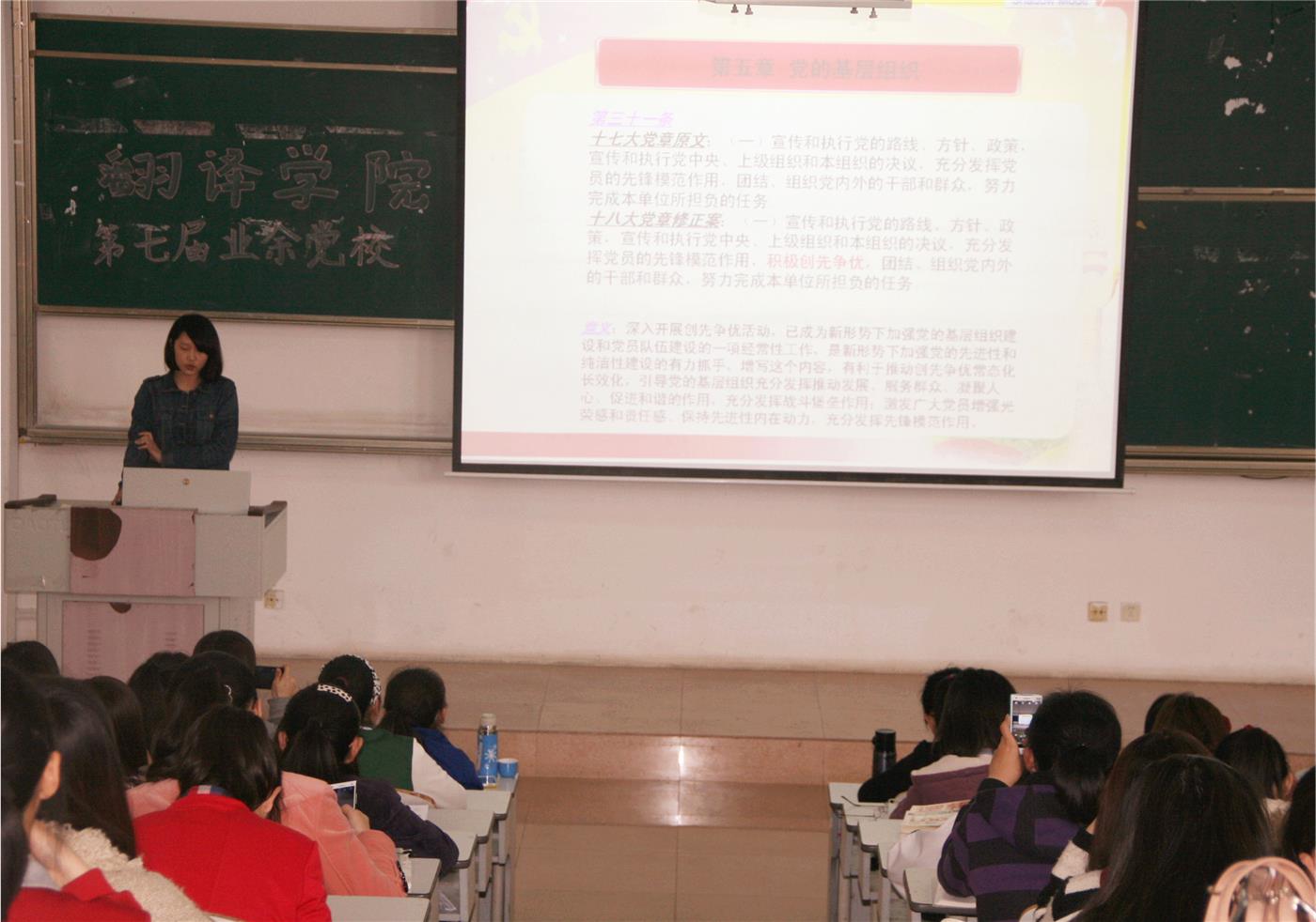 首先,王永力就党的基本知识和性质、行动指南、基本路线根本宗旨以及入党的条件等为在场同学进行了详细的讲解,并向大家介绍了八个党员必须履行的义务以及十八大新旧党章对比等知识。随后,张正旭上台就学生党支部的情况加以介绍,传达两会精神,并为同学们总结了习近平总书记和李克强总理的精彩语录。走近课堂,不时传来讲师们严谨而幽默风趣的讲课声和高亢优美的红歌声。最后,贾晓丽向大家展示了入党的基本流程,并就入党申请书的基本格式、注意事项以及递交申请书以后思想汇报的正文内容等予以解说。三位党员的精彩讲授深深地感染了每位同学,教室里不时响起热烈的掌声。