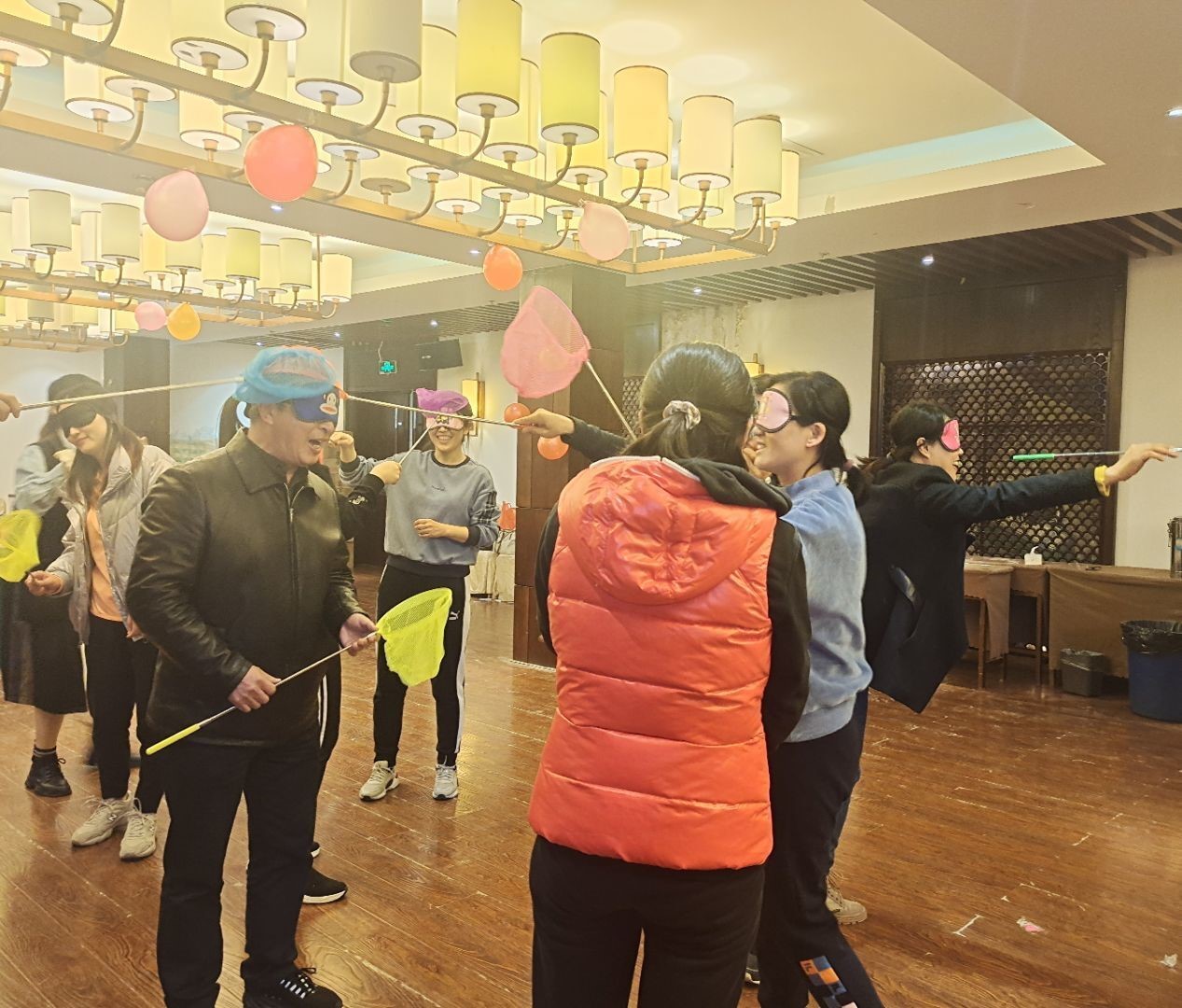 首先进行的是“瞎子领瘸子”游戏,各位老师踊跃参加,两两组队,男老师戴上眼罩,扮演“瞎子”,女老师扮演“瘸子”,“瞎子”带着瘸子在前进过程中要踩破气球,跨过障碍物,捡起地上的玫瑰花送给“瘸子”,只有配合默契才能顺利完成游戏。还有极度挑战组合默契程度的“嘴衔纸片传递面粉接力”游戏,几组老师用嘴衔住A4纸铲取一侧盘子里面粉的一部分接力传递到另一侧的盘子里,在场下老师的加油鼓励下,老师们小心翼翼地往返多次运送面粉,最终成功地到达了终点,不少老师忍不住笑出来导致面粉喷了一脸,使游戏达到高潮。在“声音辨队友”游戏中,老师们戴上眼罩,手拿蝴蝶网,通过声音辨别队友,并用蝴蝶网套住队友的头。本轮游戏体现了各位教师之间的熟悉和默契程度,现场气氛热烈,欢声笑语不断。不知不觉,近三个小时过去了,游戏大会在轻松愉悦的氛围中接近了尾声,最后工会为全体老师分发了纪念品。老师们兴致勃勃、笑容满面,直到活动结束仍然意犹未尽。