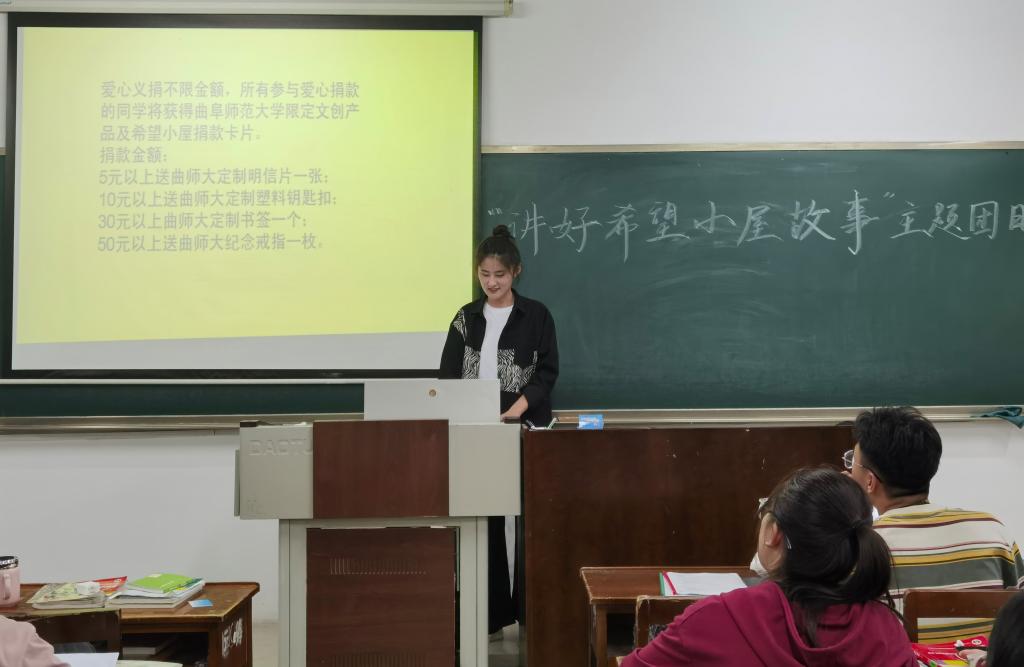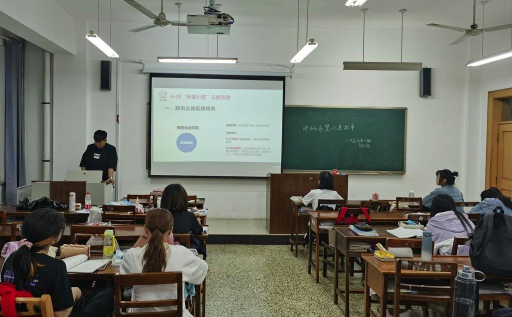 活动伊始,各班团支书通过播放PPT与宣传片的形式为同学们讲解了“希望小屋”项目发起的背景与初衷。“希望小屋”项目致力于解决贫困家庭儿童成长、学习中遇到的问题,依托其原有住房进行规划,力求为贫困家庭儿童提供一个良好的生活环境。介绍过程中,同学们认真听讲,对“希望小屋”爱心项目有了更加详细的了解。接着,团支书宣读《肉漫屋