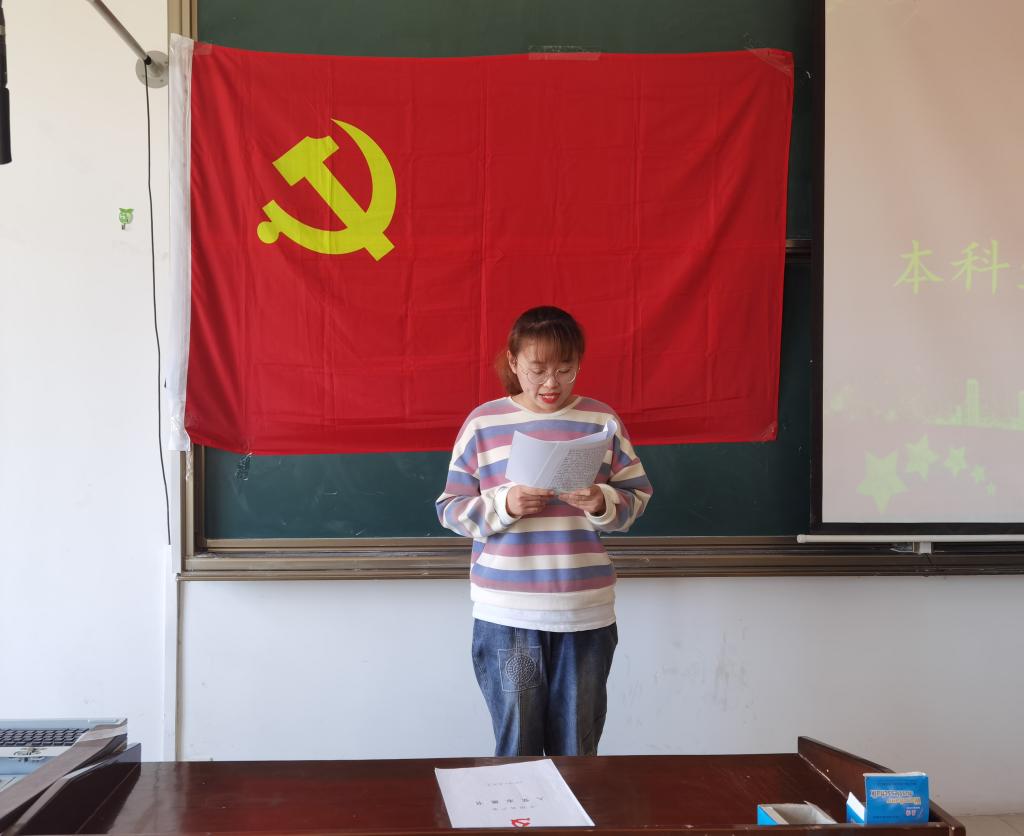 大会伊始,王峰书记向与会人员报告党员到会情况,并宣布会议正式开始。按照党员发展程序,发展对象上台宣读《入党志愿书》,表达了他们要为党的事业添砖加瓦的坚定决心。随后,两位入党介绍人对是否同意该发展对象被接收为预备党员的问题发表意见,孙杰琼同志宣读了该发展对象的政治审查报告。经与会党员讨论与无记名投票后,胡芳敏同志宣布该发展对象被接收为中共预备党员。接着,该同志发言表态,表示自己会坚定理想信念,不忘入党初心,提升个人能力,为祖国发展贡献力量。经本次大会讨论,刘云等27名发展对象均被党支部接收为中共预备党员。最后,王峰书记鼓励大家继续勤奋刻苦学习、仔细认真工作。至此,本次会议圆满结束。