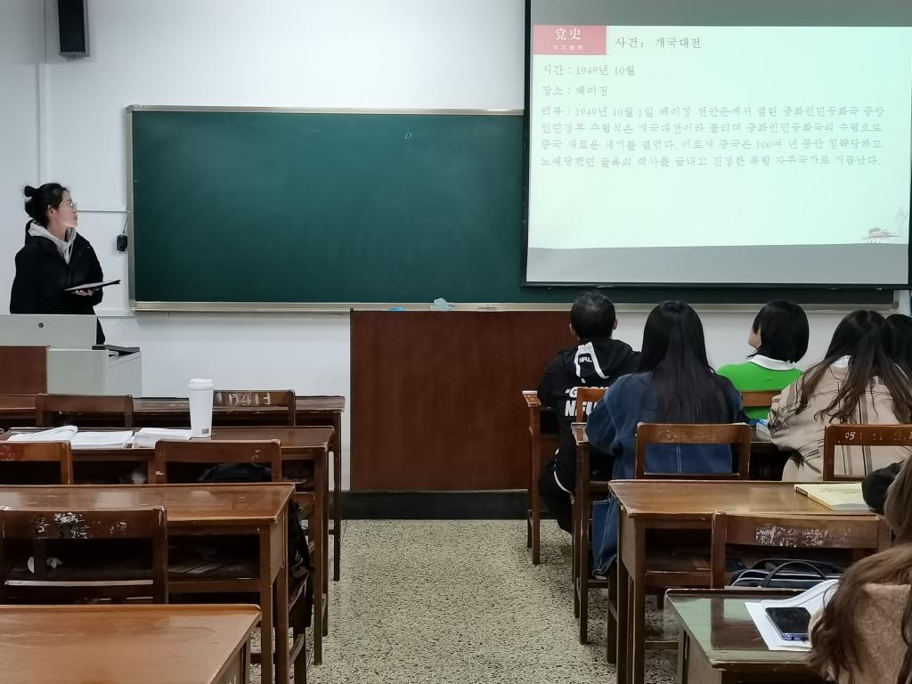 宣讲伊始,宣讲团成员依据新民主主义革命时期的党史,分别使用英语、日语、韩语对该时期的重大事件进行了讲述,并通过相关PPT进行展示。在宣讲过程中,宣讲团成员带领同学们回顾了中国共产党自五四运动到改革开放100年艰辛而辉煌的风雨历程,歌颂了中国共产党的丰功伟绩。党的历史是中华民族独立、解放、繁荣的历史,也是党为中国人民的自由、民主、幸福而不懈奋斗的历史。宣讲结束后,同学们深受感触,纷纷表示要努力提高自身理论水平,永远铭记党的光辉历史,汲取开拓前进的强大勇气和力量,为党的发展作出贡献。至此,肉漫屋