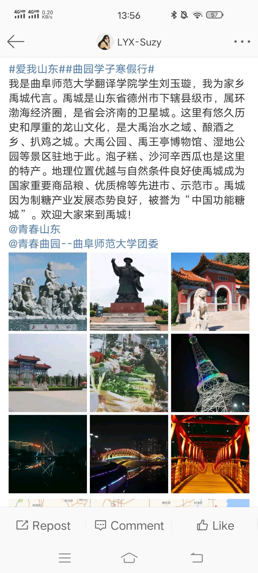 本次活动中,翻院学子们通过图文和视频的形式歌颂了家乡山东的美人美景,表达了对家乡山东的深切怀恋。同时,本次活动弘扬了山东正能量,展示了山东新时代新面貌,体现了山东博大厚重的历史人文底蕴和山东人民敦厚朴实的气质品格。