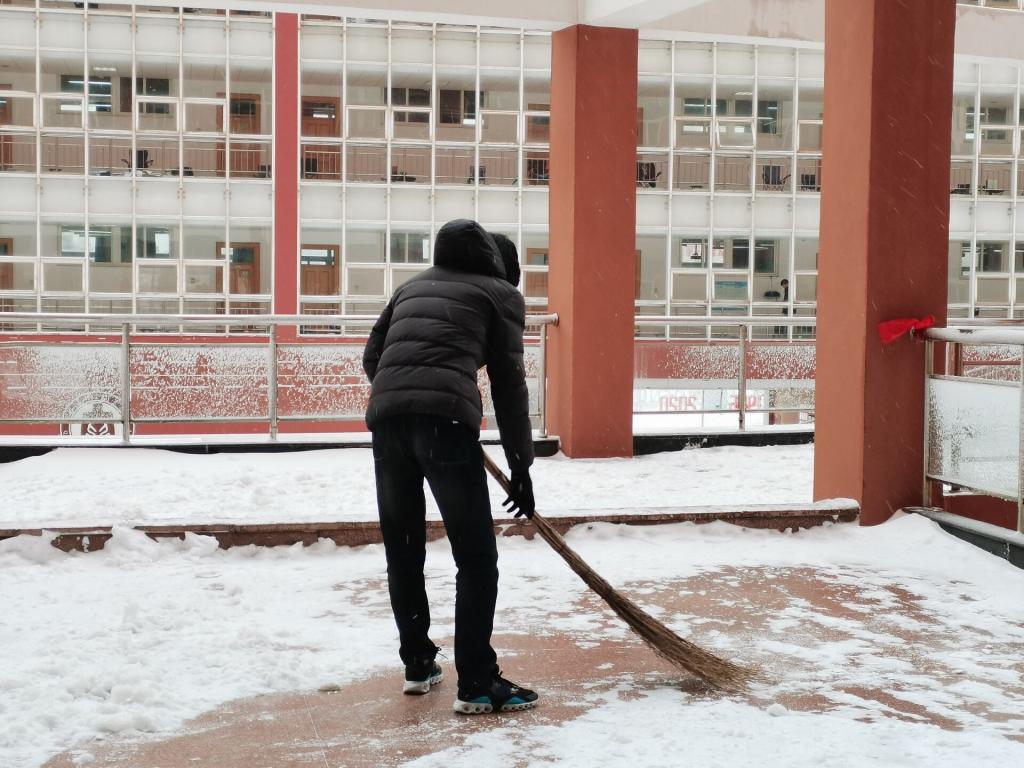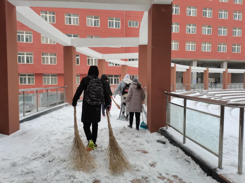 经过前期准备,参与人员准时在D教学楼前集合完毕,在明确各自分组名单及活动区域后,扫雪活动正式开始。在清扫过程中,同学们不畏严寒,挥动着扫帚、铁锹等劳动工具,清扫道路上的积雪,大家齐心协力,配合默契,铲的铲,扫的扫,把地面上的结冰和积雪铲起来并将积雪堆积在道路两侧不影响通行的位置。大家干的热火朝天,不亦乐乎,忙碌的身影构成了一道亮丽的风景线。虽然同学们的手和脸都冻得通红,但丝毫没有影响大家扫雪的热情。历经两个多小时的努力,C楼一楼、S楼、A楼、B楼等易滑易摔区域的积雪和冰层被一扫而空,出现了一条干净、整洁的通道,也为全校师生们开辟了一条洋溢着温情的畅通之路。