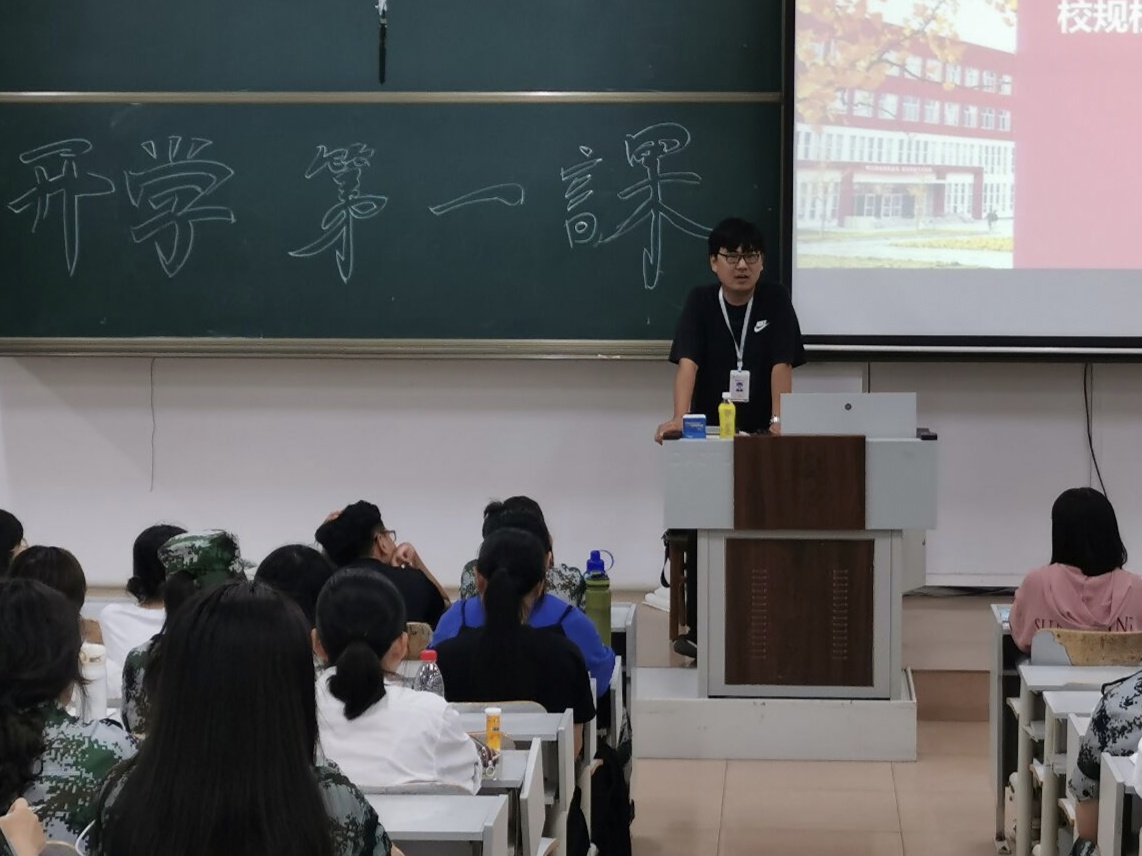 思想政治教育和管理特点,从纪律、生活、全面发展、组织培养四个方面展开论述。他强调进入新的环境要及时调整心态,转变角色,处理好人际关系,尽快投身到新的学习和生活中去。针对大学生规则意识的培养及文明行为的养成,王峰老师详细地讲解了学校的校规校纪,希望新生培养良好的个人习惯,提高自己的文明素养,争做新世纪的“四有”青年。此外,王峰老师以历年来优秀学生事迹为例,激励新生以他们为榜样,奋发图强、勇于争优。