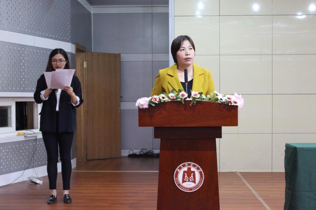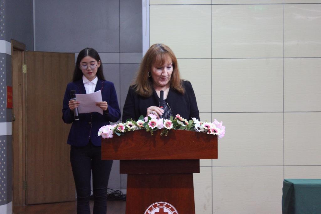 的师资力量、本科和研究生教育现状及未来的发展规划,并对新生提出了具体的要求与建议。接着,教师代表外教帕麦拉女士发表讲话,对新生的到来表示热烈欢迎,徐凤老师则以幽默诙谐的语言、通过生动的小故事向同学们展现了大学生活的丰富多彩并表达了对同学们过好大学生活、充实大学生活的期许。接着,老生代表乔宇同学、新生代表杨玉洁同学依次发言。各师生代表发言期间有来自各专业的优秀学子做现场交替传译,充分展现了肉漫屋