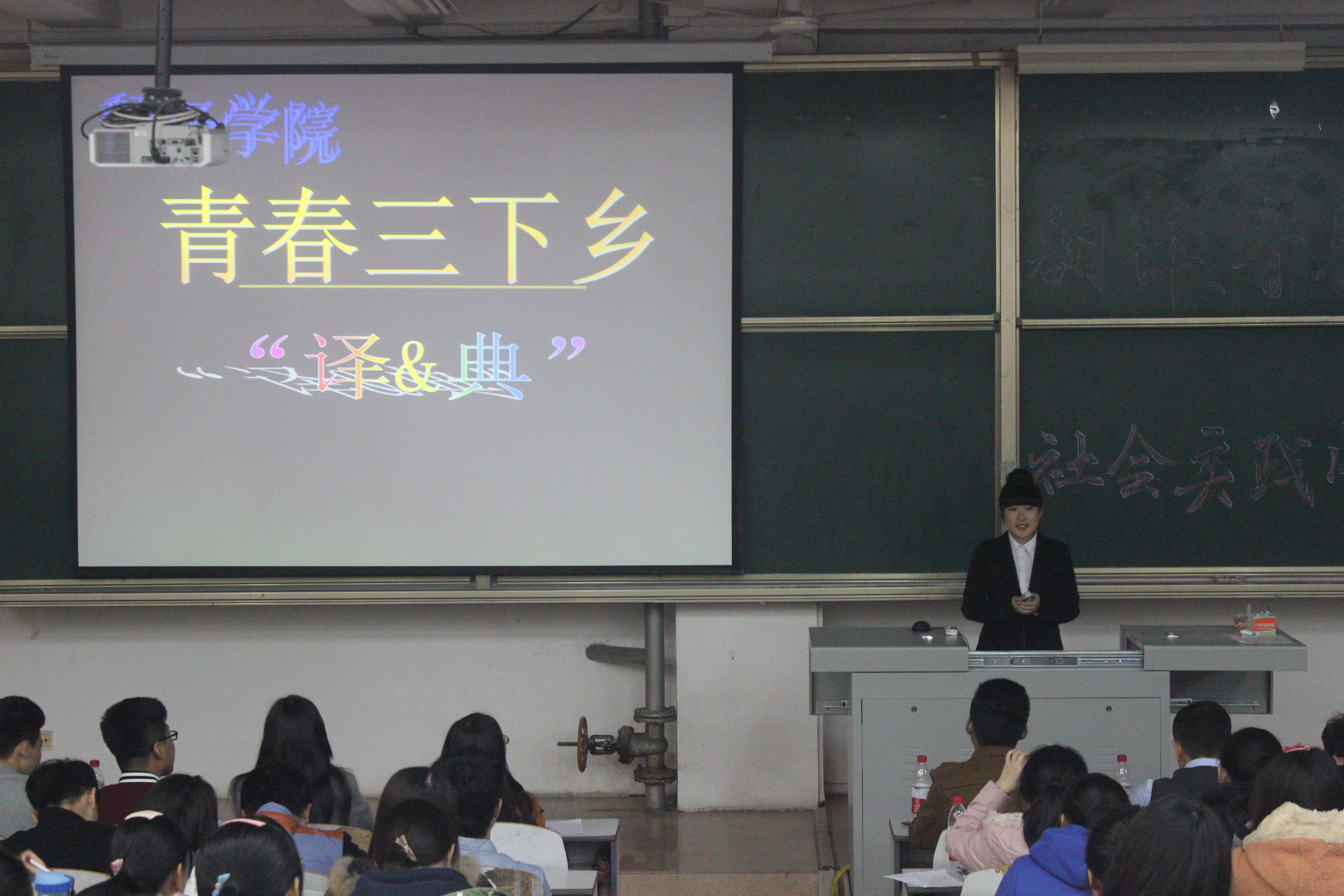 “译&典”团队进行成果展示。他们分别以朗诵、茶艺表演、即兴书法展示的形式向大家展示了他们以茶、书法及戏曲为切入点,对中国传统文化的实践调查成果,在欢笑与掌声中,让大家对我国传统文化有了更为深入地了解。展示中穿插了听曲猜戏名等互动环节,更是将活动的气氛推向了一个个高潮。随着最后一个展示项目的结束,活动在大家的掌声中落下了帷幕。