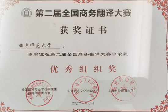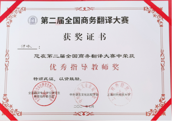 我院伊咏教授指导的商务英语专业2019级刘文江同学在第二届全国商务翻译大赛中荣获汉译英组二等奖。我院荣获优秀组织奖,伊咏教授荣获优秀指导教师奖。