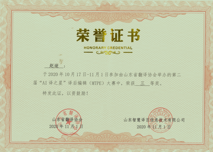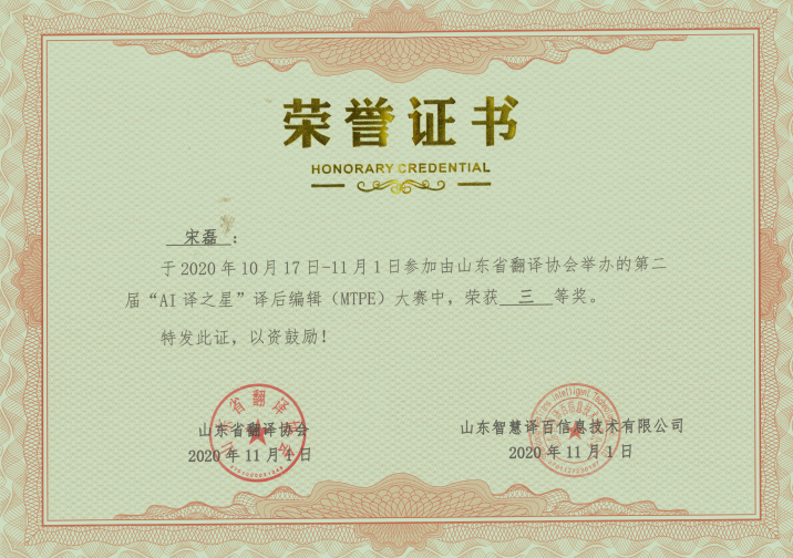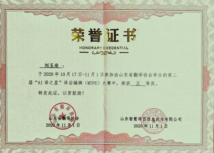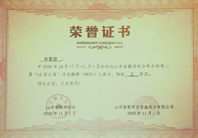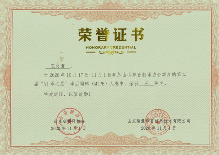 2020年11月1日,山东省第二届“AI译之星”译后编辑(MTPE)大赛比赛结果揭晓,来自肉漫屋
