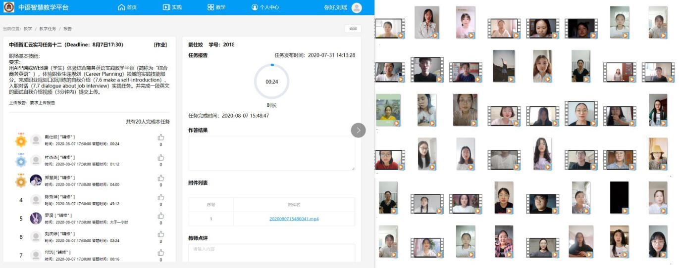 本次专业实习以“中语智慧教学平台”为网络载体,体验综合商务英语实践教学内容。平台基于云计算、人工智能、虚拟现实、移动互联网等信息技术,为学生提供外语职场能力体验师实习岗位。企业指导老师定期通过在线讲座分享国际贸易、留学等相关实务经验知识,实习生足不出户即可参与外语专业实习实践。本次实习,作为一次创新而规范有效的实习模式,真正实现了移动化、智能化、个性化、互动式的在线实习。其中,实训内容主要分为国际贸易、商业竞争、商务谈判和职业生涯规划等领域模块,紧扣专业知识内容,注重实践操作技能训练。学生们通过一次次完成实习任务和成果检验,领略不同商务领域的语用情境,熟悉实际商务流程,是一次系统的职场成长训练和考核经历。