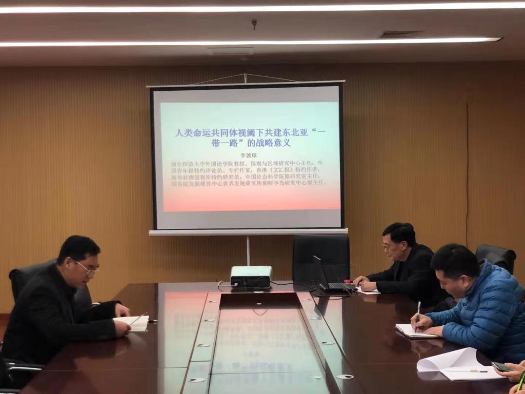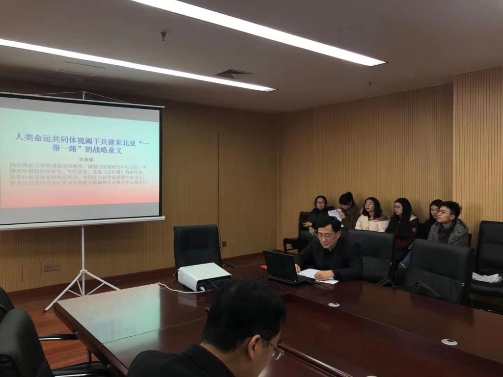 特邀东北亚问题专家、韩国成均馆大学东亚学术院博士后李敦球教授围绕“人类命运共同体视阈下共建东北亚‘一带一路’的战略意义”这一主题做了学术报告。学院院长卢卫中教授主持本次讲座,部分教师和研究生参加了本次讲座。