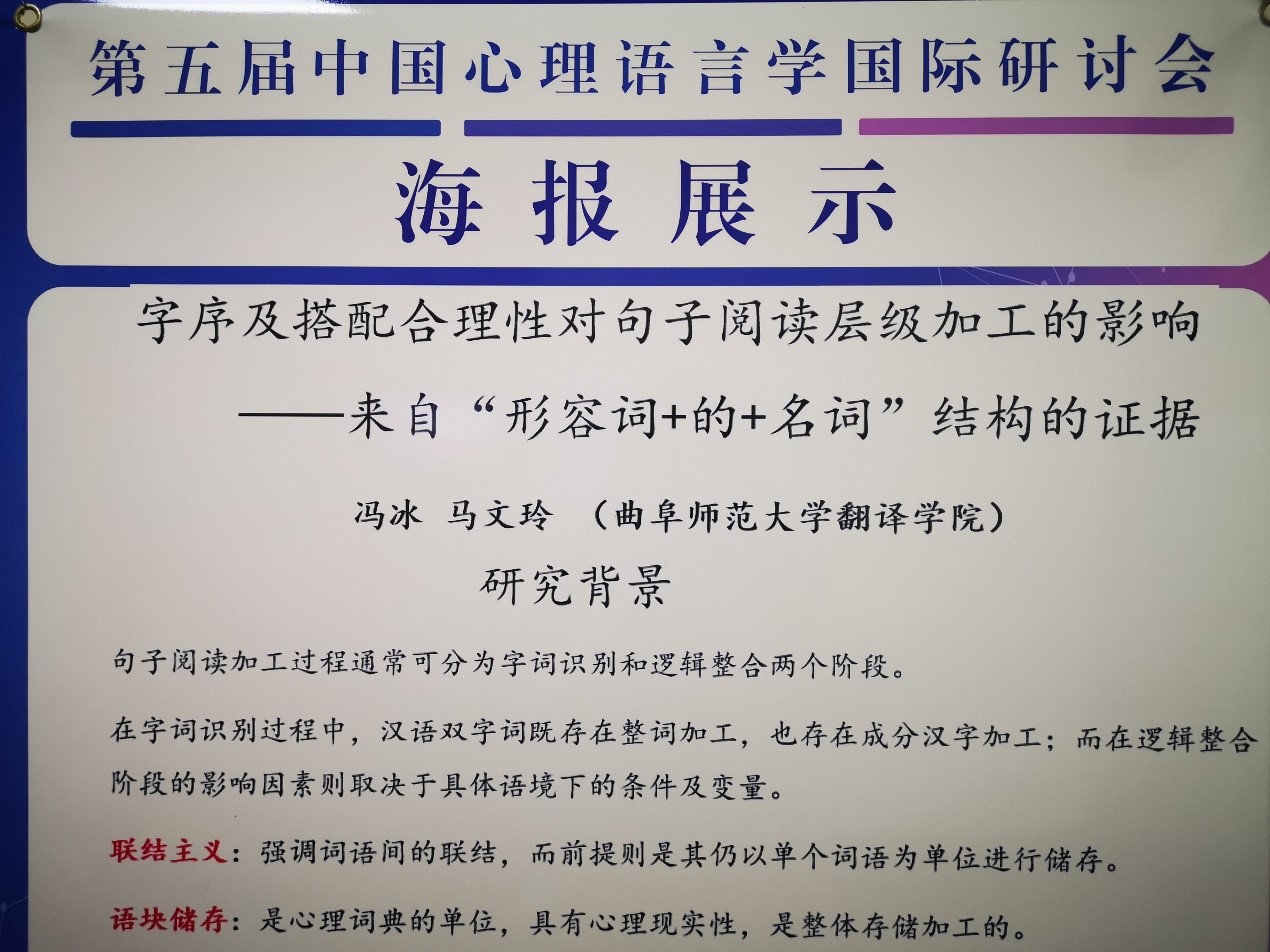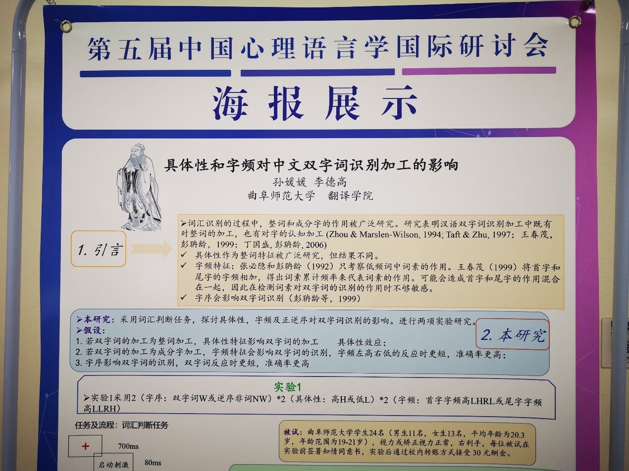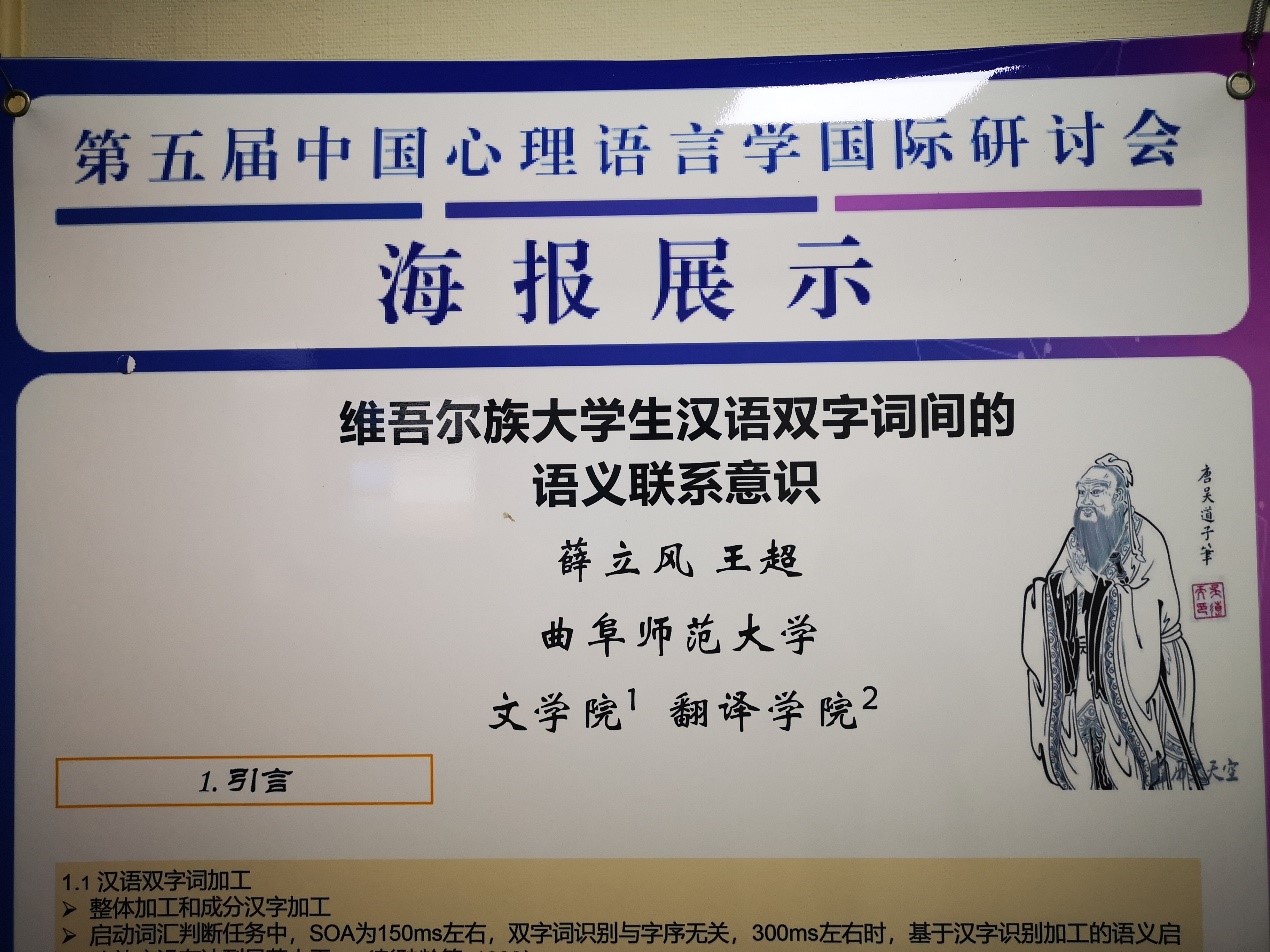 分会场上,我院的在读博士生薛立风就“维吾尔族大学生汉语双字词间的语义联系意识”研究作了汇报,其实验设计和研究成果获得了在场专家的一致认可。此外,语言与脑科学研究中心其他成员的文章也获墙报展示。我院近年来在相关领域的研究成果日益丰硕,眼动技术和ERP技术也日趋成熟,为国内的心理语言学发展做出了一定贡献,也获得参会专家的高度认可。