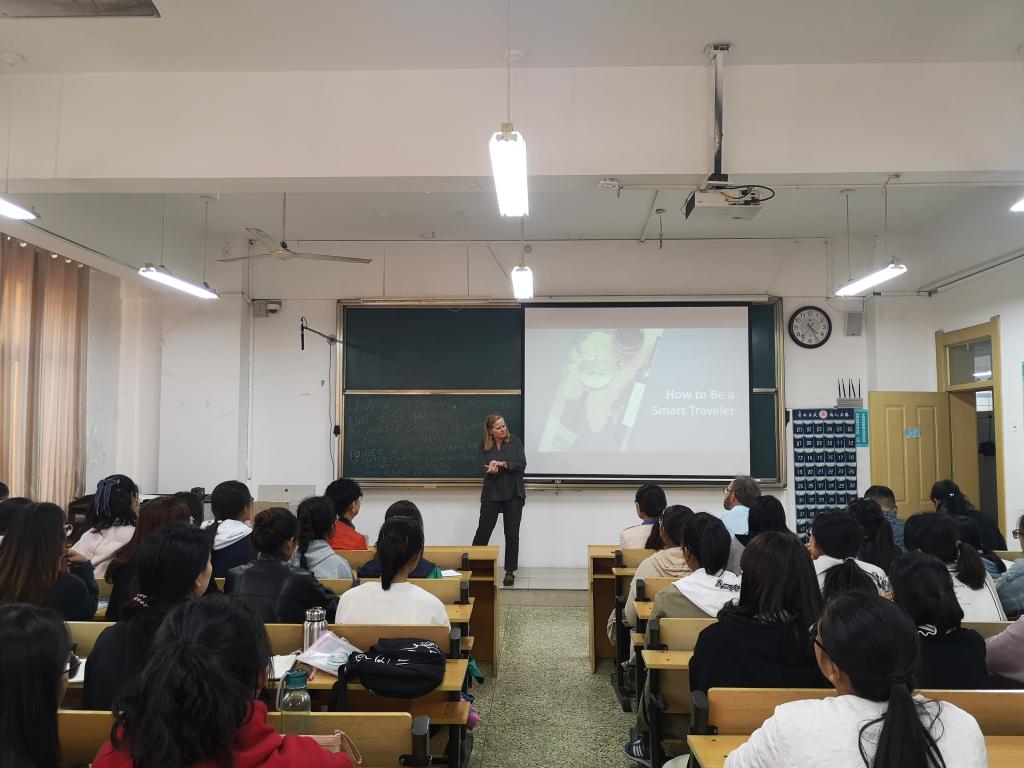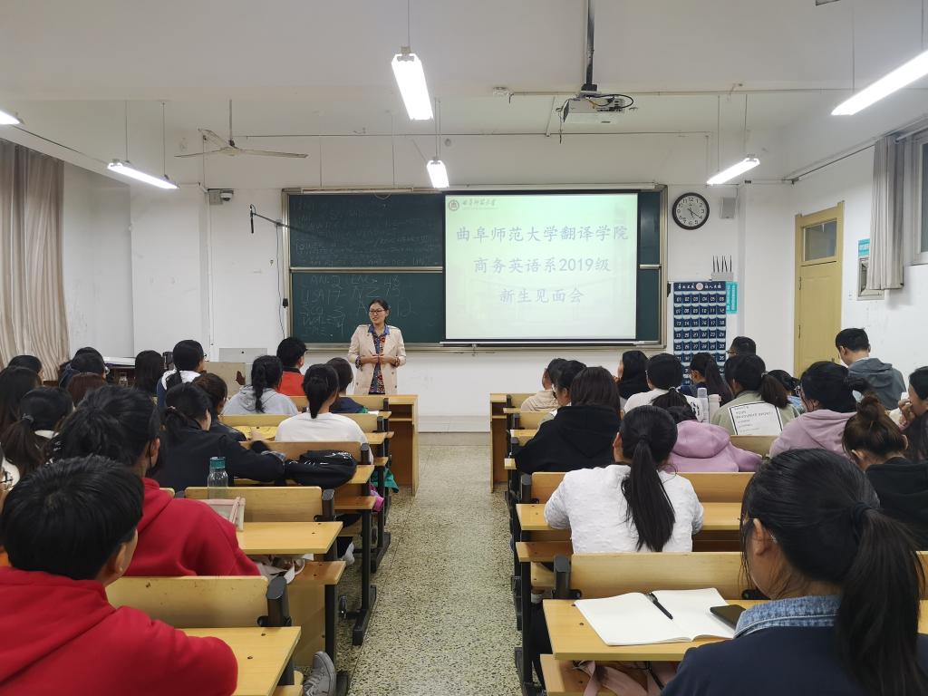 商务英语系2019级新生专业推介会在JC304举行,副院长夏云教授、山东省海外特聘泰山学者刘新新教授、商务英语系专业顾问伊咏教授、系主任刘瑶博士、外教Katie和Danel以及商务英语系的全体教师参加本次推介会,系主任刘瑶主持本次会议。