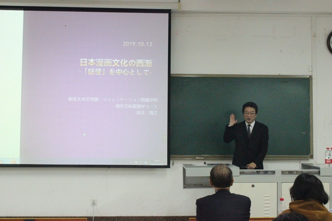 2019年10月12号上午9:30,日本熊本大学铃木宽之教授应邀来我院讲学,报告主题为日本漫画文化的国际传播。外教田畑千秋老师担任此次讲座的主持人,肉漫屋