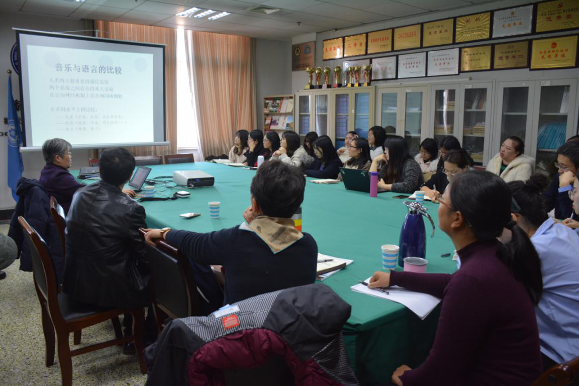 报告伊始,杨玉芳教授首先向大家介绍了音乐与语言的异同点,为大家对音乐与语言的研究提供了方向。随后,杨教授与大家探讨了音乐与语言句法加工的共享机制,从实证研究的角度,论述了音乐和语言层级结构边界的知觉和整合加工、音乐与语言复杂(嵌套)结构加工的认知神经机制,并在此基础上,对音乐句法认知加工的理论模型进行探讨。