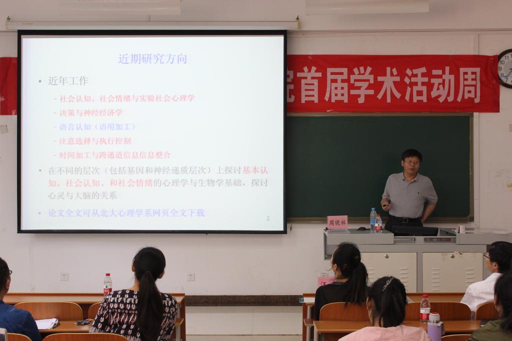 首届学术活动周”系列讲座第四讲之“汉语的神经语用学研究”。本次讲座由北京大学脑科学与认知科学中心周晓林教授主讲,我院语言与脑科学研究中心周统权教授主持,学院部分教师、全体研究生及部分本科生及其他院校的教师参加了本次讲座。