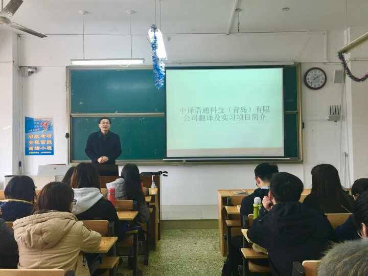 承接了实习基地青岛中译语通翻译公司的视频听译项目,并召开了项目动员大会。许家绍副教授介绍了公司基本情况和项目的基本要求,2016级英语口译翻译硕士研究生陈思为大家展示了视频听译软件的使用和注意事项,主动承担并负责了整个任务的视频分发与返稿工作。