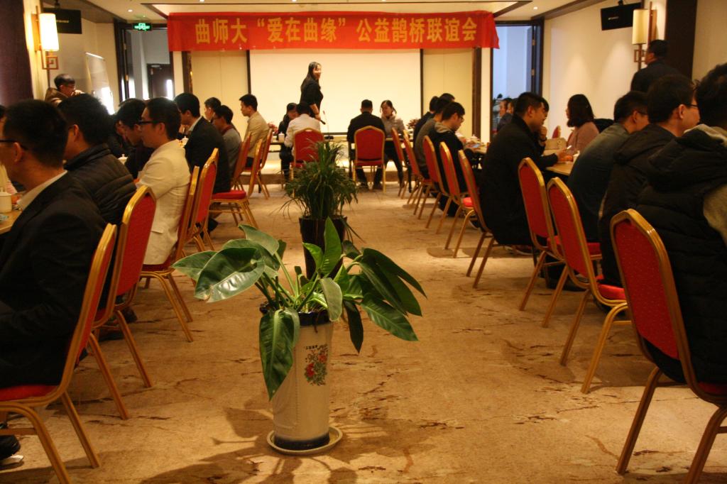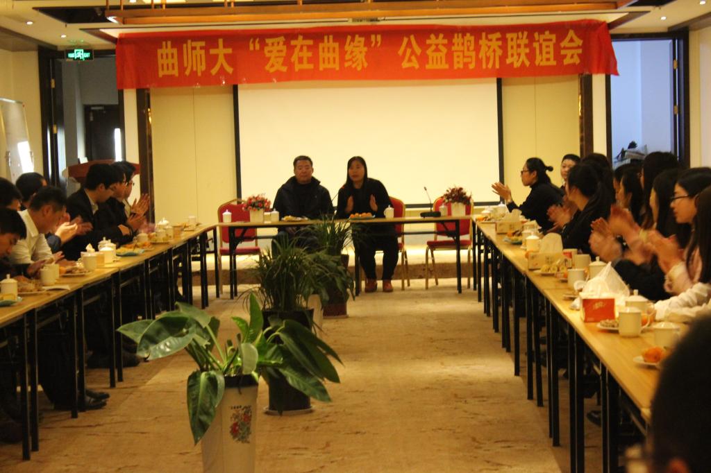 总工会成功申报的第二批工会特色活动项目之一。本项目旨在关心学校单身教职工生活、服务教职工生活、构建和谐校园、和谐社会、建设好“十三五”规划中的民生工程,分不同阶段组织单身教职工及校外有关单身人士进行鹊桥联谊,倡导婚恋新风,凝聚青年力量。活动伊始,李金雷书记先就承办此次联谊活动的目的、意义进行了简单介绍,并鼓励在场男女青年们多多互相交流、加深了解。随后,联谊活动正式开始。此次活动共由“初结良缘”、 “非常速配”、 “缘来是你””三个环节组成。在和谐、温暖、友好的氛围中,首先,大家笑容如花、按耐不住激动之情,依次进行了自我介绍,进行相互了解。紧接着联谊会进入了主办方为大家精心策划了“非常速配”环节。在这个环节中,参与者两两面对面交谈,一边品着咖啡,吃着点心,一边为梦想的爱情、为心仪的伴侣、为幸福的生活努力突出自我,对话三分钟后男士随着圆舞曲音乐的响起按顺时针交换位置,然后女士按逆时针方向交换交谈对象。通过第二环节的交流,大家进一步加深了了解,在场的男女青年们打破了最初的拘谨,纷纷展开了热烈的交谈,畅所欲言,敞开心扉、绽放激情、展现自我,将联谊会的气氛推向最高潮。接下来进行的是“爱之收获”环节,主要男女青年代表表达了自己对本次鹊桥会的感觉及自我收获。他们在发言中对这次活动的举办给予了高度评价,赞扬了曲师大工会对青年教工生活的关怀体贴和工作安排的周到细致,活动气氛达到高潮,最后在一曲浪漫的“天长地久”音乐声中落下帷幕。