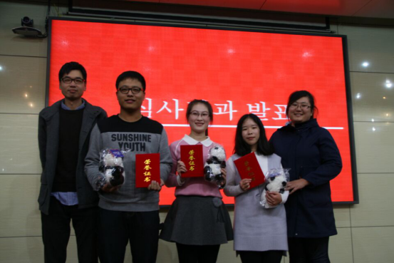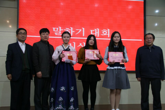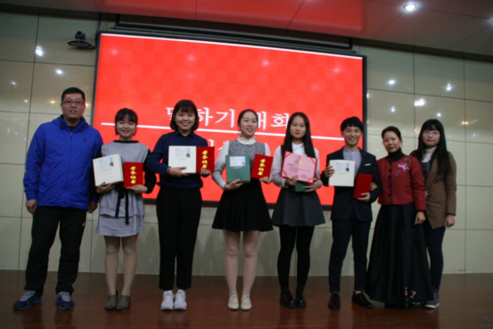 比赛伊始,由夏云副院长致辞,并由评委主任崔曦秀教授宣读比赛评分规则。此次比赛有大二、大三、大四共十八位参赛选手参加。演讲内容涵盖亲情、地理人文、韩国生活文化等各个方面。参赛选手们以流利的韩语与声情并茂的演讲感染了在场的每个人,赢得了阵阵掌声。此次比赛除选手们精彩绝伦的演讲外,还有多姿多彩的文艺汇演,悠扬的葫芦丝,动人的歌声,沁人心脾的吉他弹唱,将全场气氛推向高潮。比赛最后,崔曦秀教授根据参赛者的发音,熟练程度、语言技巧、舞台表现力等方面进行了点评评分,最终尹筱、刘蓓蓓、李婷同学分别获得了此次演讲比赛二三四年级组的一等奖。