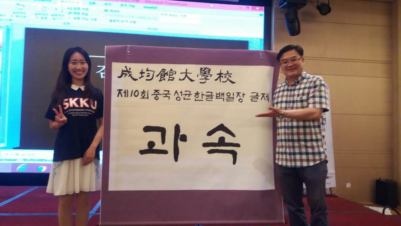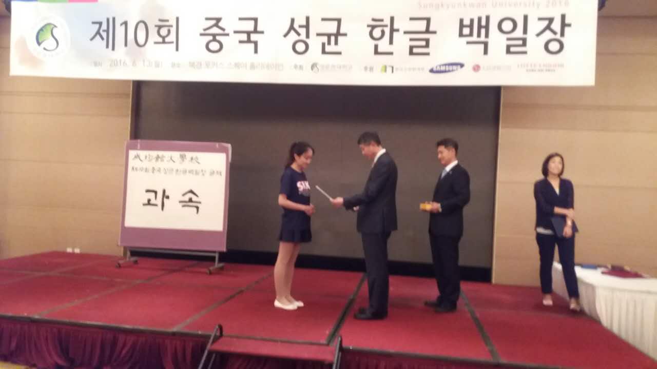 韩语系13级本科生赵雪纯在本次大赛中脱颖而出,以第二名的成绩荣获银奖,获得了全额奖学金进入成均馆大学攻读硕士研究生的机会。