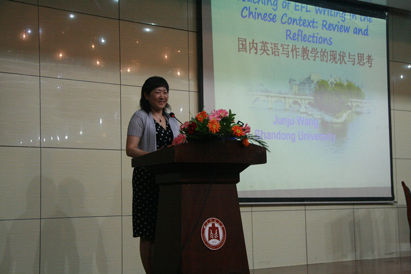 讲座伊始,卢卫中院长为讲座致辞并简单介绍了各位主讲人的基本情况,接着,由王俊菊教授发表了题为“国内英语写作教学的现状和思考”的演讲。她不仅向大家阐明了写作的重要性,还把写作教学在中国与美国的情况进行了比较,使老师和同学们更加深刻的了解国内与国外的现状与差距。同时,王教授还向大家详细介绍了写作这门课程的分类以及它们不同的特点,指出了作为一个专业英语教师应具备哪些能力和教学方法,并针对英语写作提出许多建设性建议,使老师和同学们获益匪浅。
