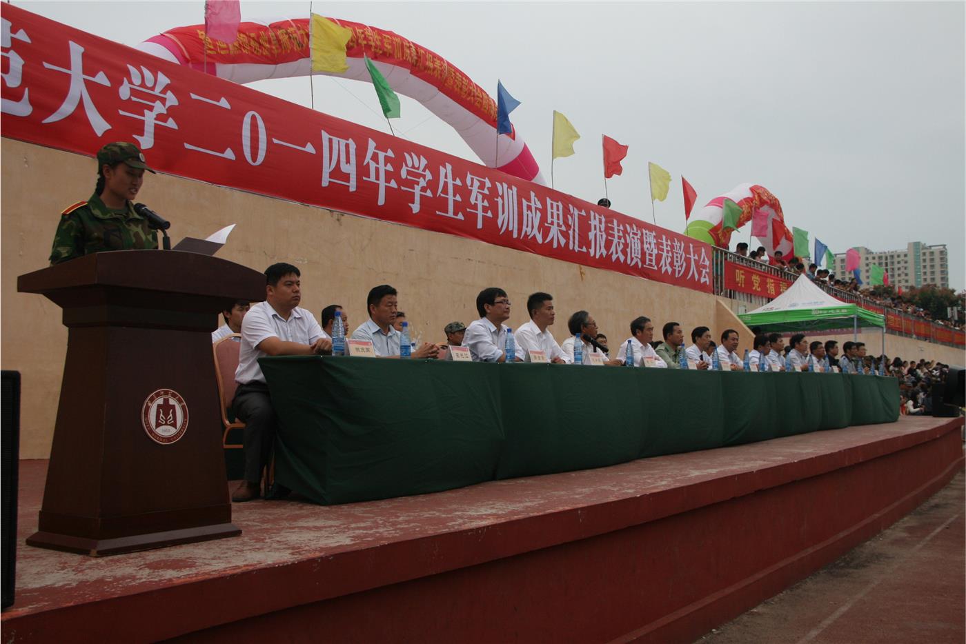 2014年学生军训成果汇报表演暨表彰大会在我校西操场隆重举行。出席大会并在主席台就座的各位领导有党委书记荆兆勋,日照市委副秘书长、大学科技园工委书记、管委主任王均波,山东陆军预备役炮兵师第一副团长、军训团团长李建勋,党委副书记、肉漫屋