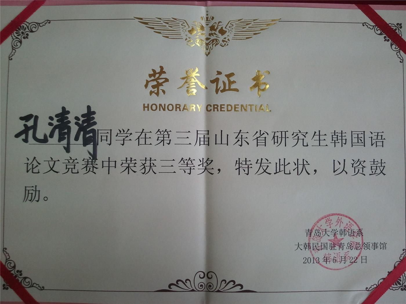 我院韩国语系12级研究生孔清清、林巧琳同学,在金东国老师的悉心指导下在学院选拔中脱颖而出,代表我校参加了此次竞赛,并分别获得三等奖和鼓励奖。